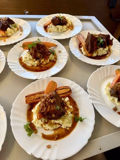 - Swordfish skewers over garlic mashed potatoes, served with green beans