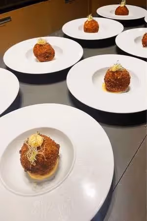 - Mac n'Cheese Stuffed Grilled Cheese Wedges in Tomato Bisque Drizzled with Chive Creme Fraiche